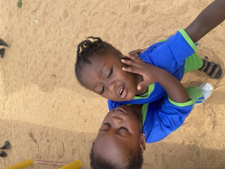 Two young children, possibly siblings, are shown in a close-up shot. They lie on the ground, which appears to be sand or dirt. Both are wearing matching blue shirts with green trim and light green pants. The child on top has their eyes open and one hand near their face, while the child below has their eyes closed. One child wears sandals, the other sneakers. A small playground structure is visible in the background.