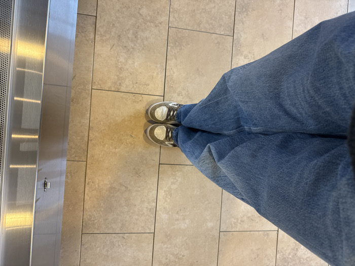 A first-person perspective shows a person standing on a tiled floor. They are wearing blue jeans and neutral-colored sneakers. To the left is a shiny, reflective surface, potentially metal, with linear designs or patterns. The floor tiles are light brown or beige and are arranged in a grid pattern. The individual's legs are the central focus.