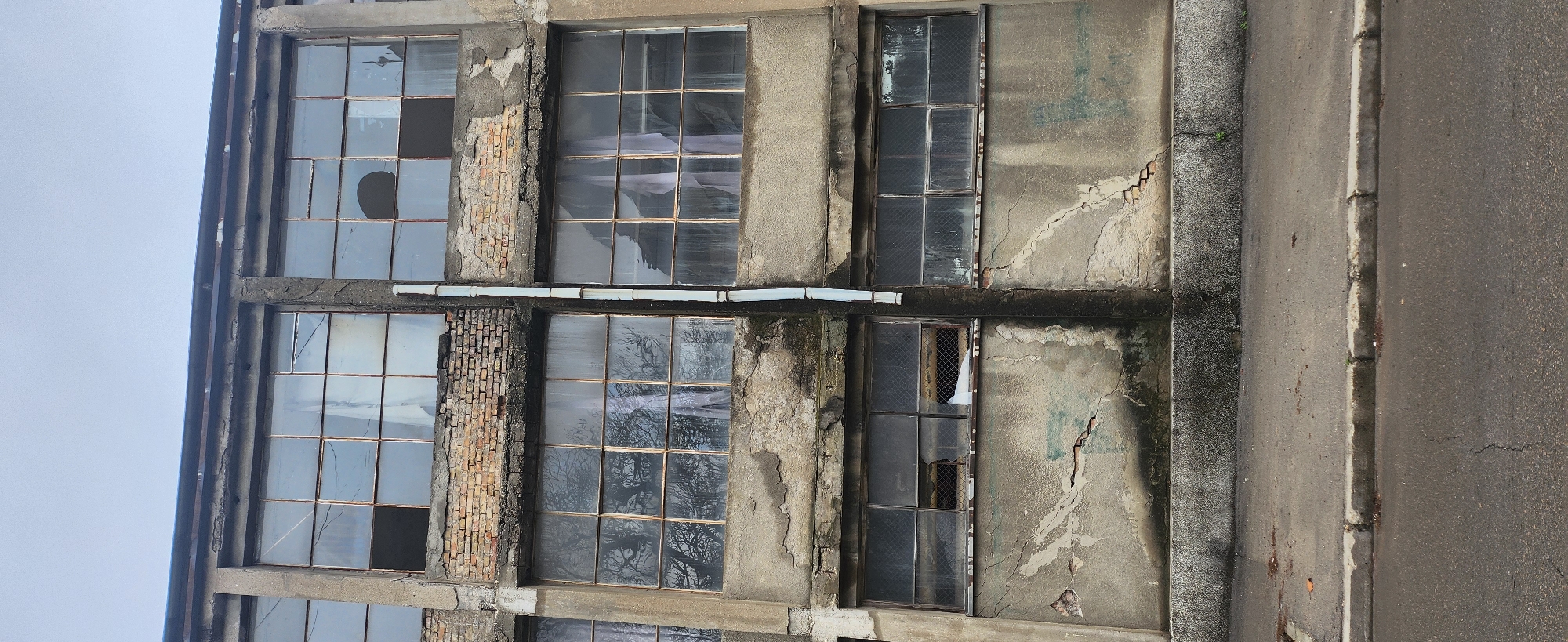 portion of a dilapidated building in Ruse, Bulgaria. The building's exterior displays significant disrepair, characterized by cracked and crumbling concrete facades. The windows are multipaned, with many panes broken or missing, revealing exposed brick and other internal building materials. The windows suggest an industrial or institutional type of structure, typical of older parts of Ruse. Adjacent to the building is a street, with asphalt visible and a curb. There is no presence of people or interaction in the captured frame. The environment appears overcast and gloomy.