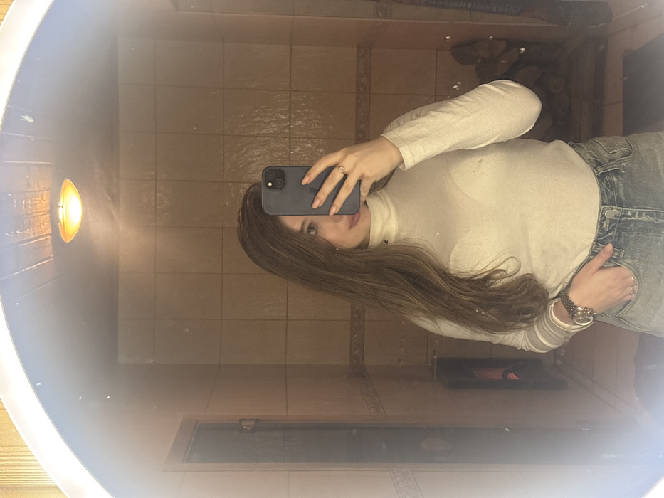 A mirror selfie of a woman with long, light-brown hair partially obscuring her face