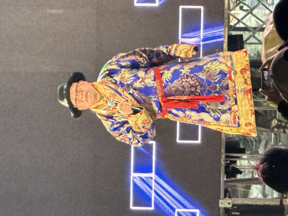 An adult male stands center-frame on a stage in Baiyun District, China. He wears a dark fedora-style hat, glasses, and an elaborate, long-sleeved robe. The robe is predominantly blue and gold, adorned with intricate patterns resembling dragons and traditional motifs, and secured with a red sash and tassels around the waist. He holds a silver-colored microphone in his right hand, positioned as if speaking or performing. The background features a large, dark display screen illuminated with bright blue and white rectangular geometric patterns. The lower foreground reveals the heads and raised hands of audience members, some holding smartphones, positioned below the stage level.