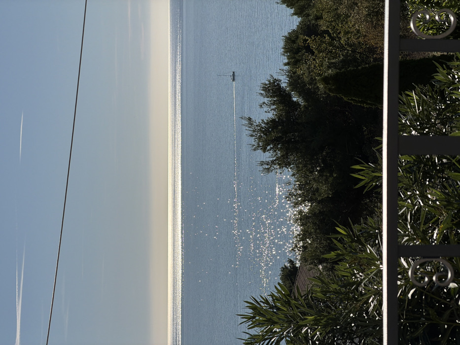 This image presents a daytime, elevated view of the Adriatic Sea from Sutomore, Montenegro. In the foreground, a grey metal balcony railing with vertical balusters and a decorative scroll on the right is visible. Immediately behind the railing, dense green foliage, consisting of various trees and bushes, partially frames the lower portion of the scene. The midground features the blue expanse of the sea, heavily reflecting sunlight, creating numerous bright glints on the water's surface, particularly on the left. A small, white sailboat with a mast is positioned on the water, moving from right to left, leaving a distinct wake. A dark green treeline forms a natural boundary between the foreground vegetation and the sea, with a glimpse of a red-tiled roof peeking through the trees on the far left. The background shows a clear, light blue sky with a bright, hazy horizontal band along the horizon. Two faint, thin white contrails are discernible in the upper sky. A single, dark, thin power line or cable stretches horizontally across the upper third of the image. No people are visible.