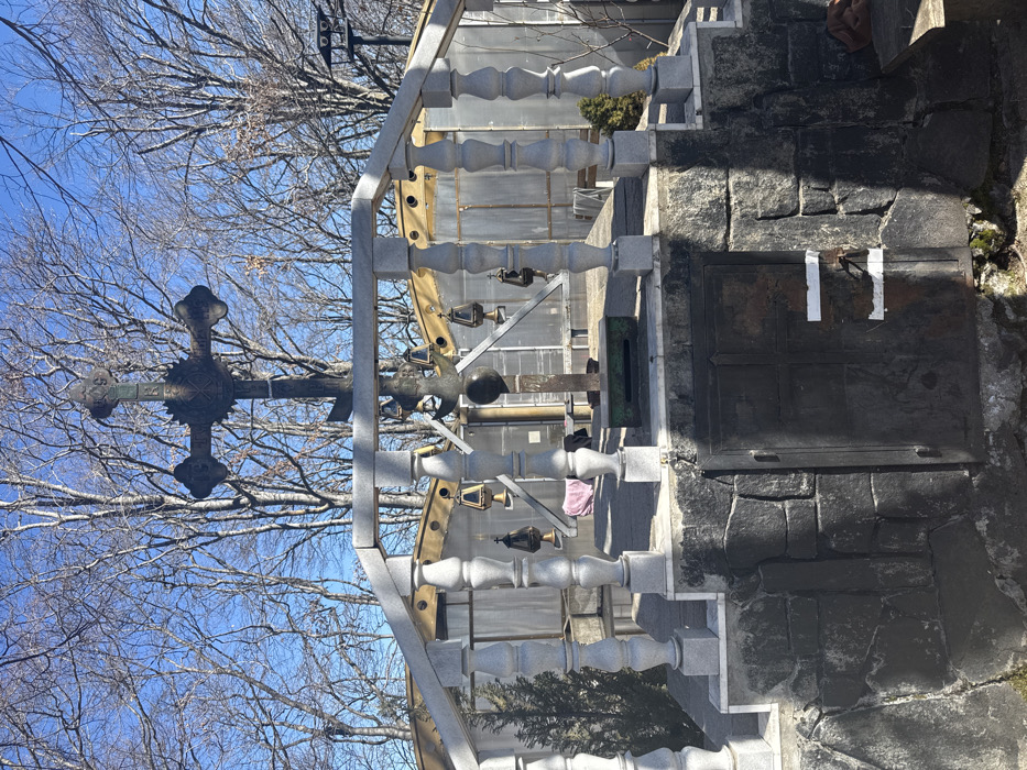 The image depicts an outdoor shrine or memorial structure under a clear blue sky, situated in a forested area, confirmed to be in Mostovo, Bulgaria. The central subject is a tall, ornate dark metal Orthodox cross, likely made of cast iron or bronze, featuring intricate carvings and what appear to be Cyrillic inscriptions, including "IC XC" and "NI KA". The cross is partially wrapped with white material near its base. It stands on a multi-tiered stone platform. The upper tier of the platform is enclosed by a light gray granite or stone balustrade with turned balusters and a flat railing. Within this enclosure, centered below the main cross, is a secondary vertical structure from which multiple dark metal, bell-shaped or lantern-like objects hang by chains. A dark, spherical object is integrated into this central structure, with a green rectangular object visible at its base. A light pink fabric item is draped over a surface behind this assembly. The balustrade rests on a light gray stone base, which in turn sits on a dark, rough-hewn stone or concrete foundation. The front of this foundation features a dark, distressed metal door, possibly made of cast iron, with two horizontal white marks on its surface. The background consists of numerous tall, bare deciduous trees, indicating a season without foliage. Behind the shrine, partially obscured by the balustrade, are structures resembling greenhouses or sheds with translucent or corrugated panels and visible framing. The ground in the foreground is uneven, showing some soil and sparse green vegetation, with a small evergreen shrub visible to the left of the balustrade. The scene is brightly illuminated by direct sunlight, casting distinct shadows. No individuals or active interactions are present.