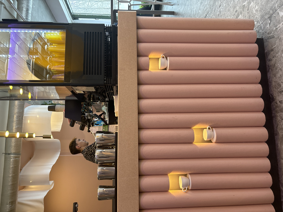 The image displays the interior of a modern cafe or coffee shop located in Zelenogradsk, Russia. A male barista, with short, light brown hair and wearing a black shirt with white polka dots, stands behind a counter, facing right and attending to equipment. The foreground features a light-pink, vertically fluted counter that includes three recessed, illuminated niches, each holding a white ceramic teacup on a small circular platform. On the flat, light-colored countertop, four polished stainless steel milk frothing pitchers are lined up. Behind the barista, a black commercial espresso machine is visible. To the right, a tall, black, glass-fronted display refrigerator contains multiple clear plastic bottles filled with a yellow liquid, illuminated by purple light from within. The back wall is a solid light salmon color, with white fabric drapes and a metallic duct running across the ceiling, from which gold-toned pendant lights hang. A large window on the far right reveals an outdoor scene with bare trees, indicating a potentially overcast or winter environment. The floor is covered with gray tiled flooring.