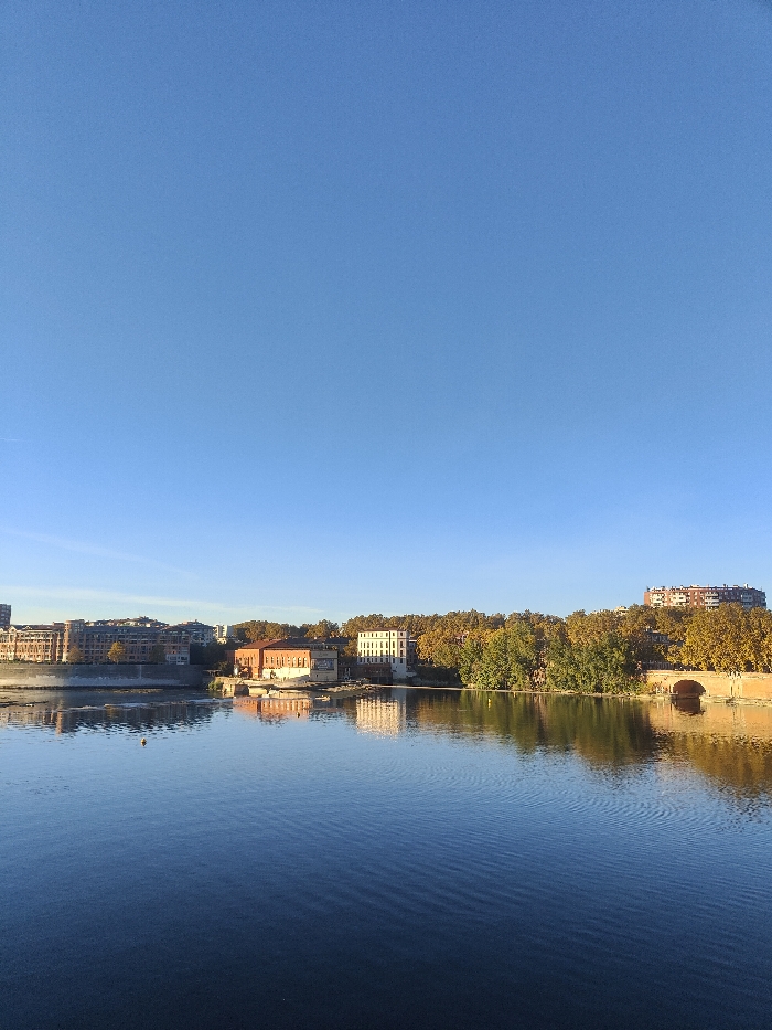 This image captures a panoramic view of the Garonne River in Toulouse, France, likely from the Pont Saint-Michel or a nearby quay on the left bank, looking generally north-east. The upper half of the frame is dominated by a clear, uninterrupted deep blue sky. Below the sky, the horizon features a dense band of urban architecture and natural foliage. On the far left, a cluster of modern, multi-story buildings with visible balconies and light-colored facades line the riverbank. Moving right, a prominent, older brick building with a reddish tile roof stands directly at the water's edge. Immediately adjacent to it on the right is a white, multi-story building. These structures are partially illuminated by sunlight, suggesting early morning or late afternoon. Further to the right, a dense belt of trees displays autumnal colors, predominantly green with significant yellow and orange foliage. Above and behind these trees, on the far right of the frame, a distinct, large, rounded building with a dome (identifiable as the Dôme de la Grave) is visible. Below the trees and to the far right, a sturdy brick archway, part of a bridge (likely Pont Neuf), extends into the river. The lower half of the image is occupied by the calm, reflective waters of the Garonne River. The water is dark blue, showing gentle ripples and clear reflections of the buildings and trees on the opposite bank, particularly the brick and white buildings. A small, yellow spherical buoy is visible floating in the mid-left section of the river. No people, explicit actions, or direct interactions are discernible within the frame.