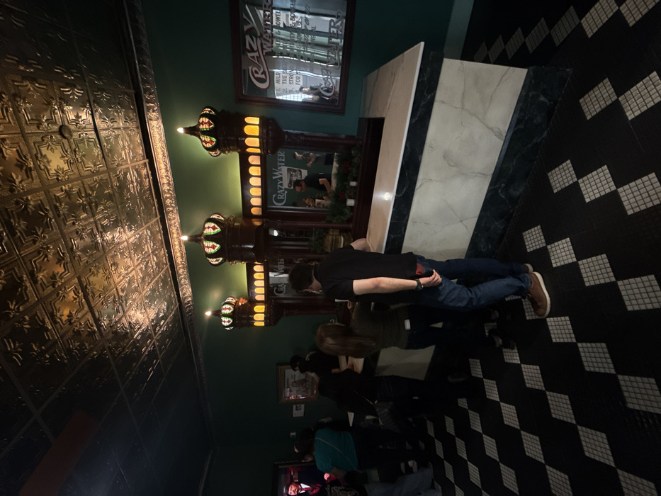 n interior space with a textured ceiling. The wall features illuminated fixtures with ornate tops and signage that reads "CRAZY WATER." Several people are standing near a high, light-colored marble counter. The floor is a checkerboard pattern of black and white tiles. A framed advertisement is partially visible on the wall.