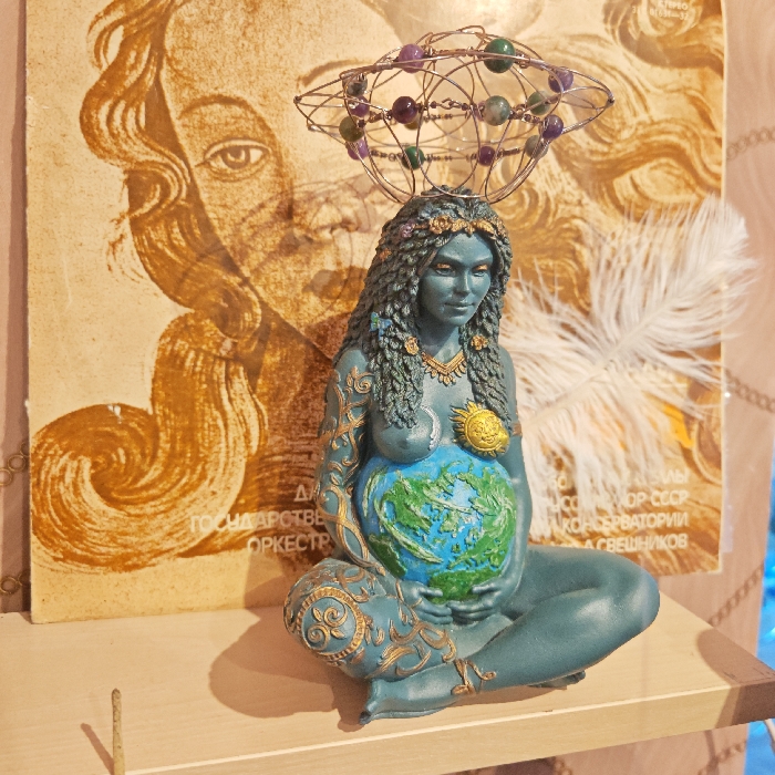 A teal-colored female figurine is depicted in a seated, cross-legged posture on a light wooden shelf in Rostov Veliky, Russia. The figurine's body and face are blue-green, featuring long, dark blue-green wavy hair adorned with small floral elements. Intricate gold-colored patterns are present on her arms, legs, and chest. She wears a gold necklace, and her upper torso displays a gold crescent moon and a gold sun emblem. A wireframe halo, embedded with purple, green, and amber-colored beads, rests on her head. Her hands cradle a spherical object representing Earth, with blue oceans and green continents, positioned over her belly. To the left of the figurine, a slender, light-colored stick, consistent with an incense stick, stands upright on the shelf. The background consists of a sepia-toned poster featuring a detailed illustration of a woman's face and flowing hair. Visible Cyrillic text on the poster includes "ГОСУДАРСТВЕННЫЙ ОРКЕСТР" (State Orchestra). To the right of the figurine, a white feathery object is partially visible against a light-colored patterned background, likely a curtain or wallpaper.