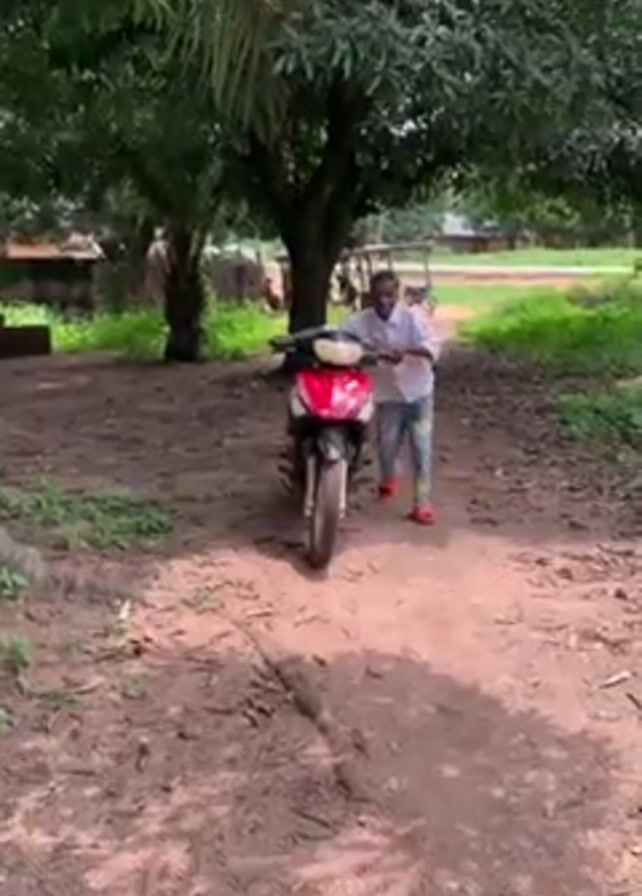 A man is walking a red and black moped down a dirt path. The man is wearing a white shirt, blue jeans, and red shoes. The path is surrounded by green grass and trees. In the background, there is a building with a tin roof and a few people standing around. The man is walking towards the camera.