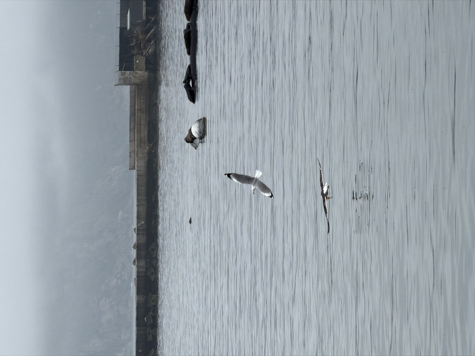 The image depicts a misty, overcast scene at a harbor in Hout Bay, South Africa. The foreground features calm, grey water with visible ripples. In the mid-ground water, one Cape fur seal is partially submerged, lying on its back with its lighter belly exposed. To its right, a cluster of at least three additional Cape fur seals rests on a dark, low-lying object or structure within the water. Further to the left, a small, dark shape, possibly another seal, is partially visible above the water surface. Two birds are in flight over the water: a white and grey seagull with black primary flight feathers is positioned centrally, wings spread in mid-stroke; below and to its left, a darker bird, possibly a tern or skimmer with a dark back, white underparts, and an orange beak, flies extremely low, skimming the water's surface, with its reflection visible beneath it. In the background, a substantial concrete breakwater or pier extends horizontally across the frame, with structural elements and a darker section on the right. Distant mountains or hills are heavily obscured by thick fog or mist, blending into the overcast sky above.