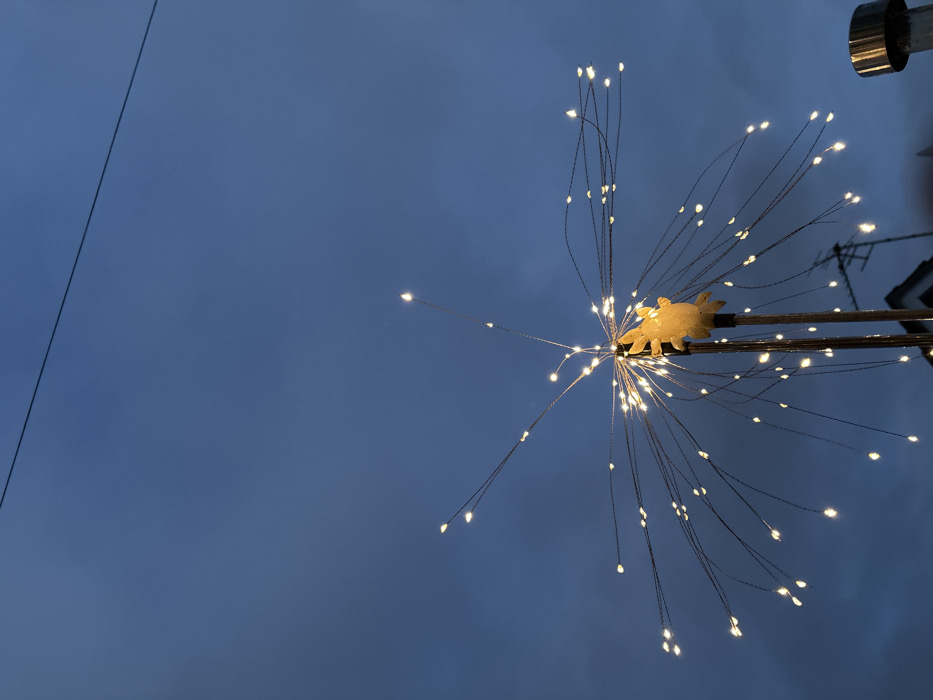 The scene depicts an illuminated outdoor decorative light fixture at dusk in Oswestry, United Kingdom. The primary subject is a starburst-patterned LED light, composed of multiple small, warm-white bulbs extending from a central hub via dark, flexible wires. Affixed to the central support pole of this fixture is a small, pale yellow ornamental figure resembling a pig. The light assembly is mounted on two vertical metallic poles. The upper two-thirds of the image display a dark blue-grey sky, traversed by a single, thin dark utility cable. The lower background reveals a blurred roofline and an antenna of a building, along with the upper portion of a metallic, cylindrical object, likely a solar light, positioned on the extreme right. No individuals or discernible actions are present.
