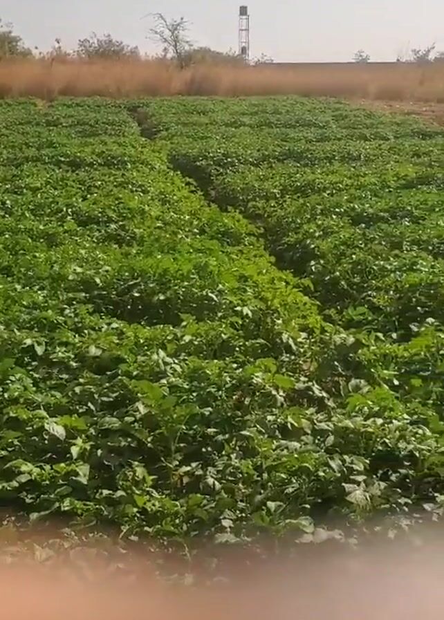 wide shot of a large, vibrant green field of plants, likely crops, with rows clearly visible. In the distance, there's a water tower and a line of trees on a slightly raised bank. The sky is a pale blue, suggesting a sunny day. The camera moves slightly, revealing patches of bare brown soil in the foreground. The focus remains on the field, highlighting the density and health of the plants.