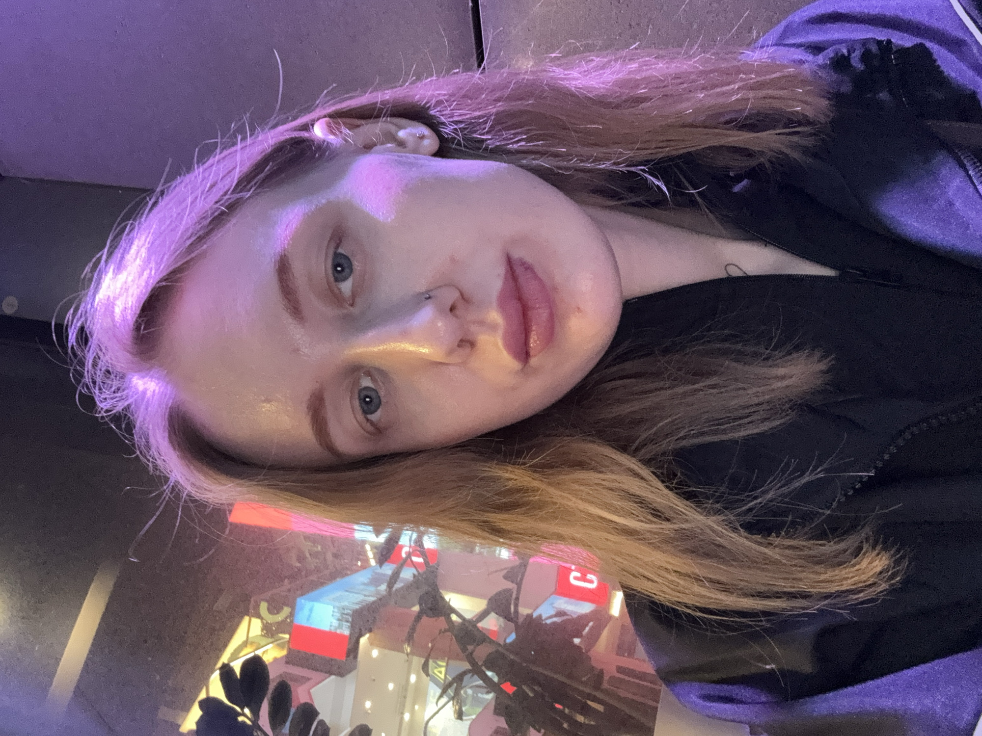 A selfie of a young woman with fair skin, blue eyes, and light brown hair. She has a nose piercing on the left side of her nose. The lighting has a strong purple hue. She's wearing a dark-colored jacket. A reflection of a building with red and blue signage is visible.