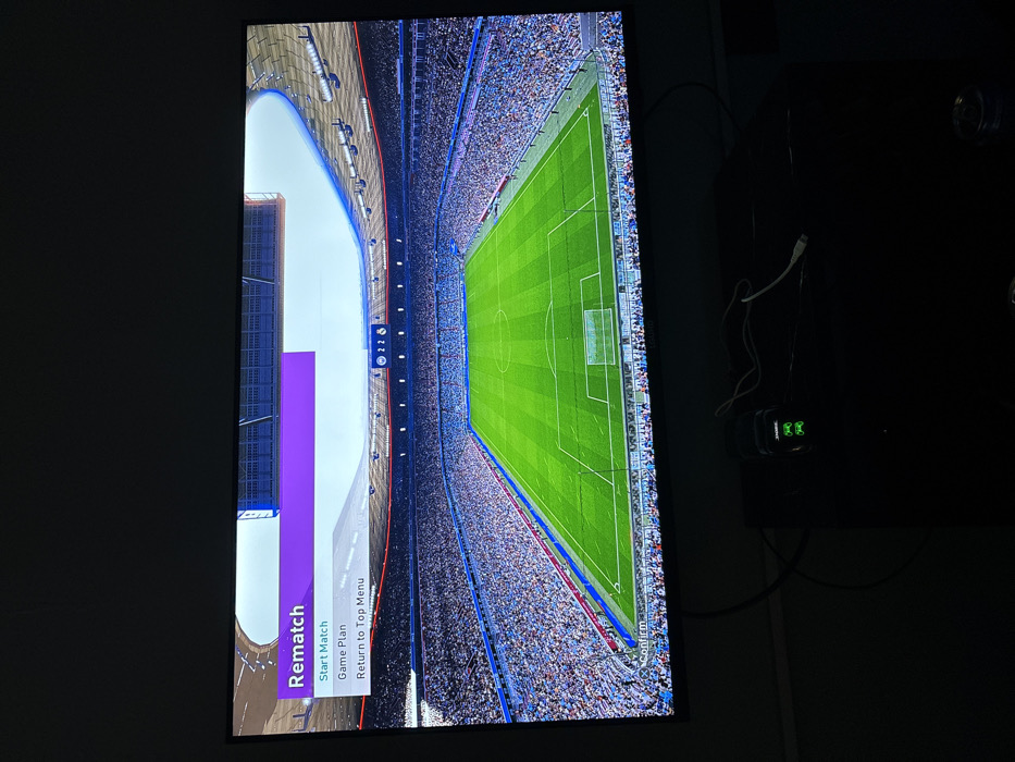 A television screen dominates the frame, displaying a video game that simulates a large, fully illuminated football stadium. The stadium features a meticulously maintained green pitch with marked lines, goalposts, and a packed audience filling multiple tiers of seating, predominantly in shades of blue and white. A digital score of "2 : 2" is visible at the top center, flanked by what appear to be team crests, one resembling Manchester City's and another a crown logo, likely Real Madrid's. An overlay menu on the top left highlights "Rematch" in a purple bar, with options below for "Start Match," "Game Plan," and "Return to Top Menu." The screen's surface is glossy, reflecting minimal ambient light. Below the television, on a dark, flat surface, an electronic device with two glowing green game controller icons is visible, along with white and black cables. A silver cylindrical object, possibly a beverage can, is partially visible on the far right. The immediate environment around the television is dimly lit, suggesting an indoor setting in low light. No information within the image identifies the location as being within Rukn ad-Din Municipality, Syria.