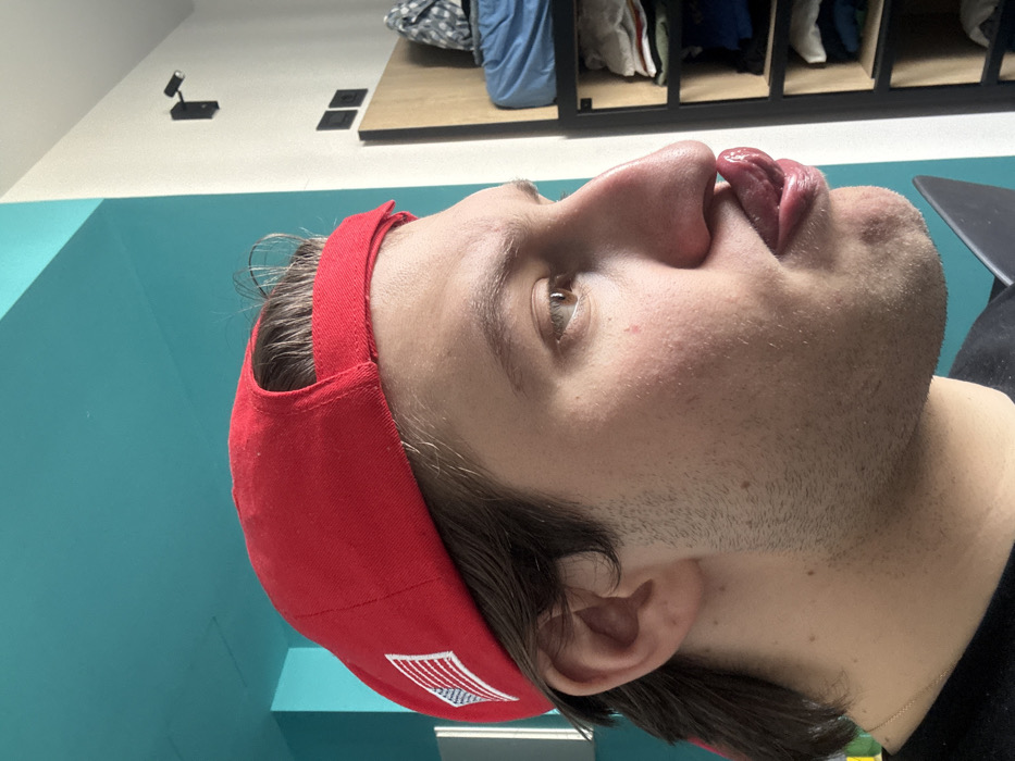 A close-up, profile-view photograph depicts an adult male in an indoor setting in Novate Milanese, Italy. The subject, positioned on the left, wears a red baseball cap backward, featuring a white embroidered U.S. flag patch on its left side. He has short brown hair and visible stubble on his jawline and chin. His right eye is visible, looking towards the right. The subject's tongue is extended upwards, making contact with the underside of his nose. He is wearing a dark-colored shirt, with a thin gold chain partially visible around his neck. The background features a vibrant turquoise wall on the left, transitioning to a white wall on the right. On the white wall, a black two-head wall lamp is mounted, along with two black electrical outlets or switches below it. A light-colored wooden shelving unit or headboard, containing folded items of clothing, is partially visible on the far right.