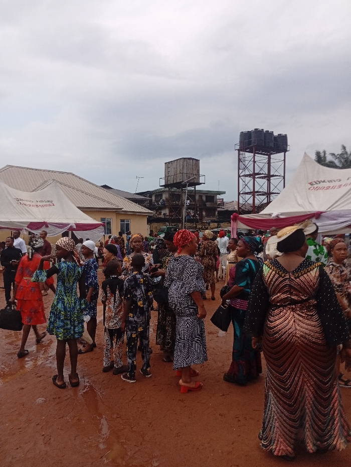 The image depicts an outdoor gathering of approximately 20-30 individuals in Fegge, Nigeria