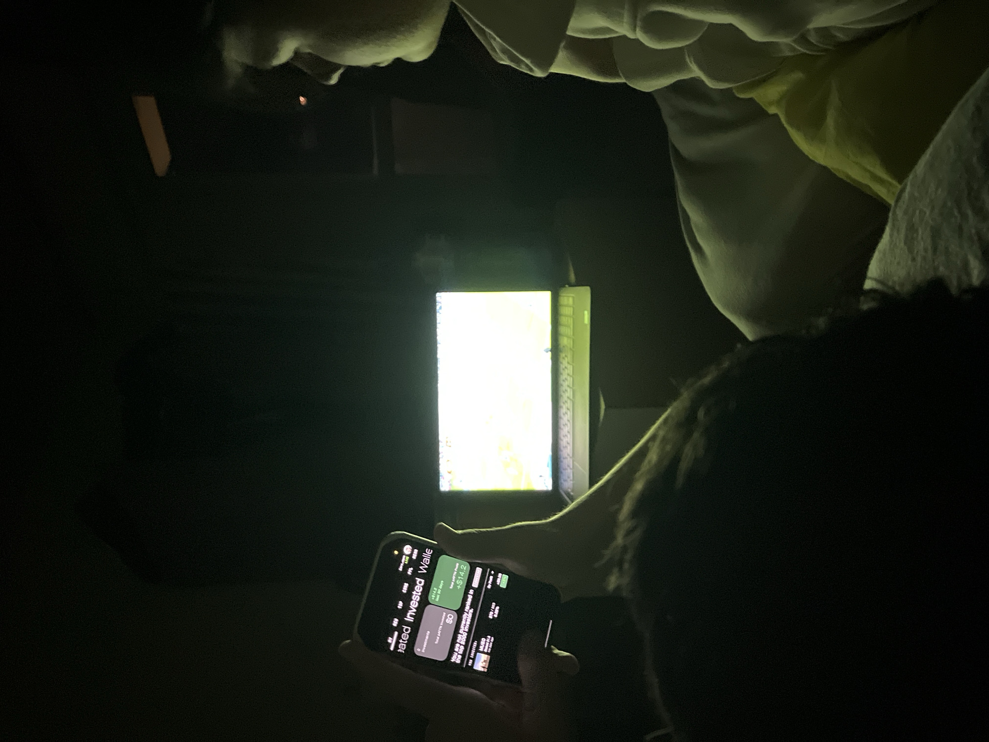 A group of individuals are gathered in a dimly lit room, illuminated primarily by the glow of electronic devices. One person is holding a smartphone, which displays a screen with financial information. Nearby, a laptop screen emits bright light, further illuminating the scene. The environment appears to be indoors, possibly in a residential setting given the casual attire of some of the individuals. The location in Shumen, Bulgaria is not discernible from the image.