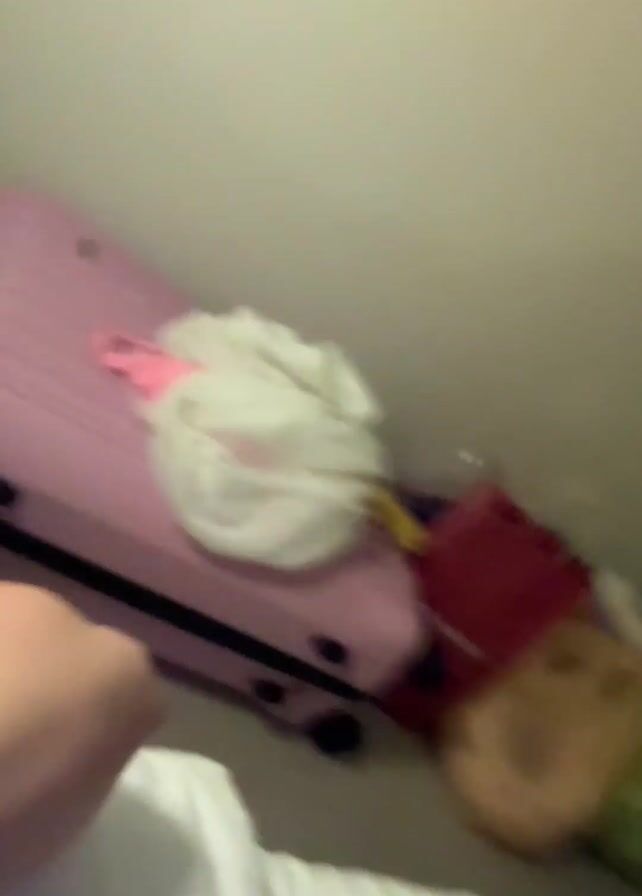 A woman in a white tank top speaks to the camera, stating that her Seven Eleven purchases no longer fit into her suitcase, because there are too many bags. The camera pans to show a suitcase and multiple colorful shopping bags on the floor of the room. The room has plain white walls and what appears to be a dresser.