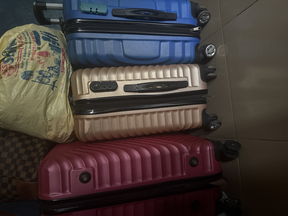 stack of four pieces of luggage and a plastic bag