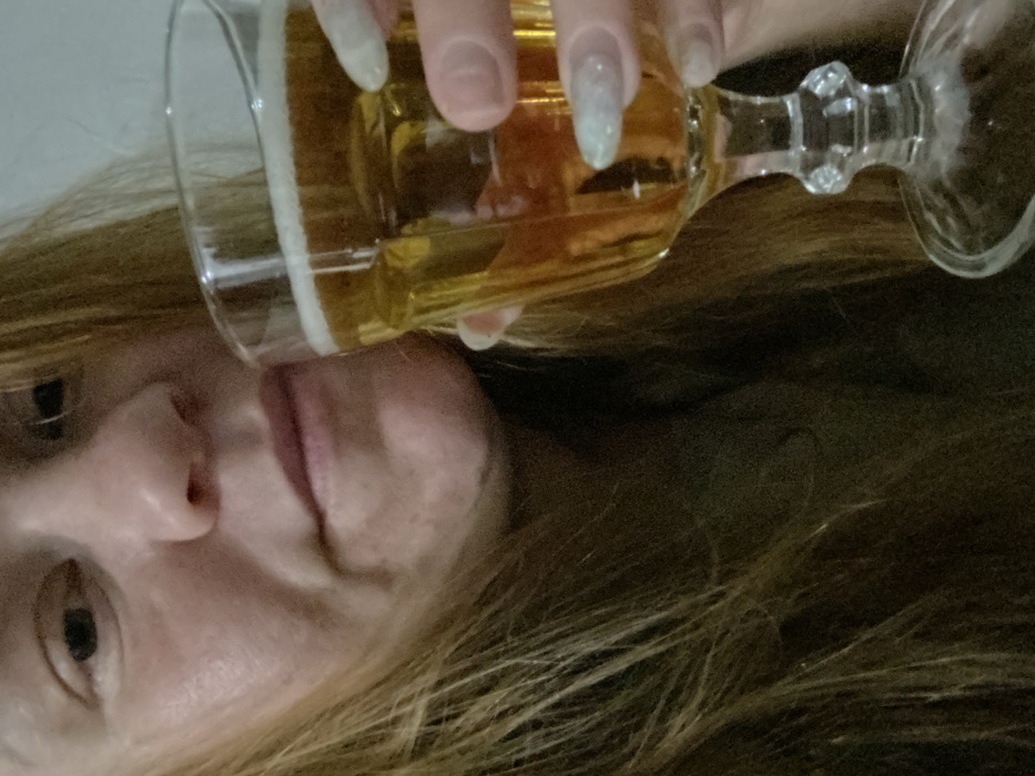 A woman with blonde hair lies on her side, her face close to the camera. She holds a glass filled with a golden liquid, possibly beer, close to her mouth. Her nails are long and painted. The glass is clear, and the liquid has a foamy head. The background is blurry and indistinct, but appears to be a light-colored surface.