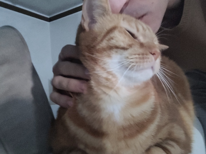 - "An orange tabby cat with closed eyes and a content expression is being petted" by FM-lpZ3r2, licensed under CC BY 4.0