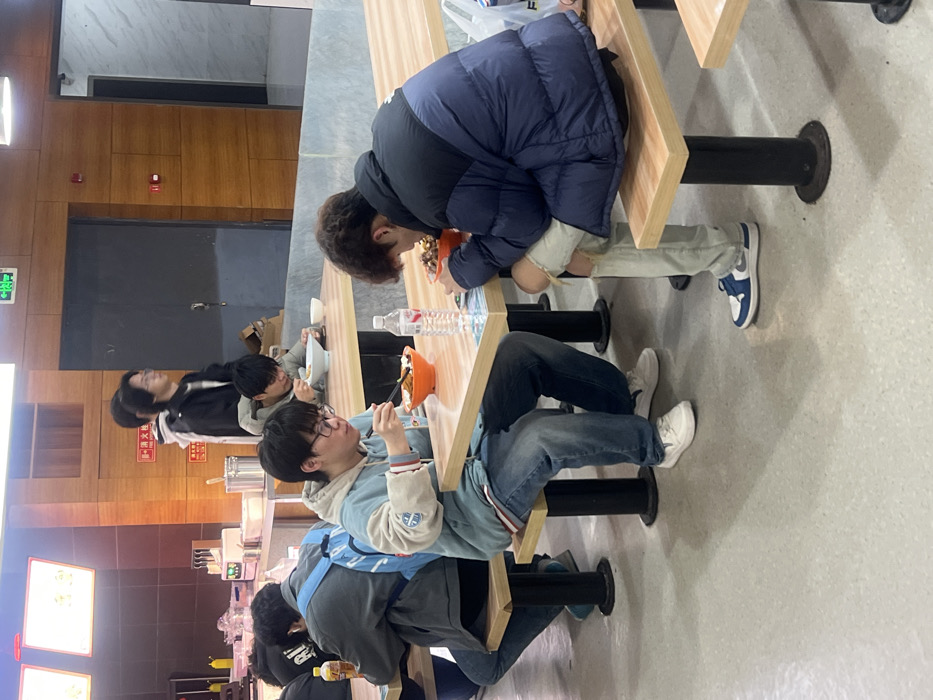 This image captures an indoor food court or cafeteria scene located in Jiangjin, China. The environment features light-colored walls, sections of wooden paneling, and a light grey floor. Multiple patrons, primarily young adults, are seated at light-colored wooden tables equipped with integrated benches. In the mid-ground, a young male wearing glasses, a light blue and white varsity-style jacket over a grey hoodie, and blue jeans is seated on a bench, actively eating from an orange bowl with chopsticks. A clear plastic water bottle is positioned on the table in front of him. He is wearing white sneakers. Adjacent to him, on the right, another young male in a dark blue and black puffer jacket and light-colored ripped jeans is also seated on a bench, hunched over an orange bowl as he eats. He wears blue and white Nike Jordan 1 Low 'Game Royal' sneakers, and a white plastic bag rests on the bench next to him. In the immediate background, another individual with a light blue backpack is partially visible from behind, seated at a table on the left. Further back, additional patrons are seated and eating at other tables. On the left side of the background, a food service counter is visible, equipped with yellow condiment dispensers and stainless steel containers. Two males are standing near a wooden-paneled wall in the background; one, wearing a black jacket and white hoodie, is looking to the right. A green 'EXIT' sign and a red fire extinguisher symbol are affixed to the walls.