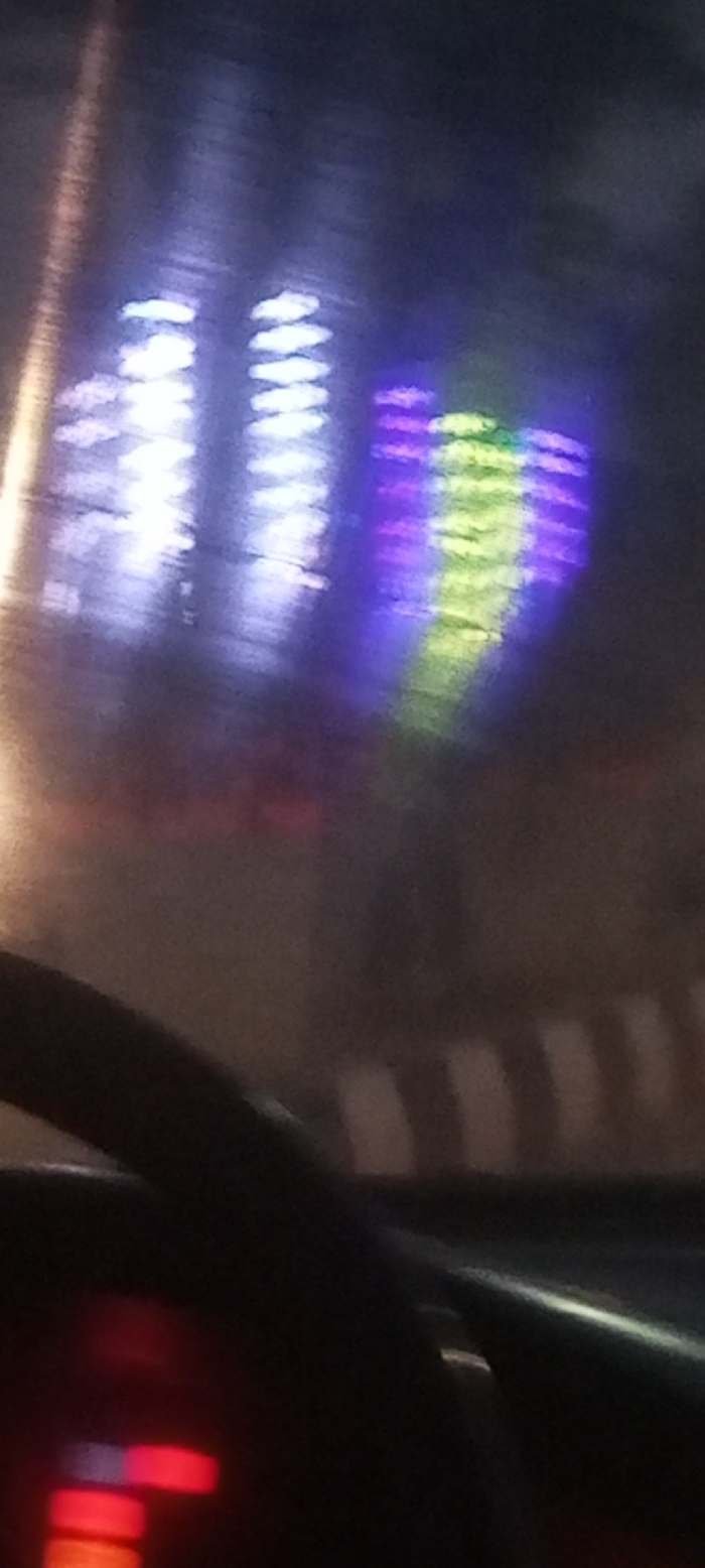 blurry view through a car windshield at night. Bright, colorful lights are visible outside, including white, purple, and green, potentially from a building or sign. The car's steering wheel is visible in the foreground, along with a blurry dashboard with red lights. The overall scene is dark and unclear due to the wet or dirty windshield, which creates a distorted view of the outside environment. Road dividers are also seen through the windshield.