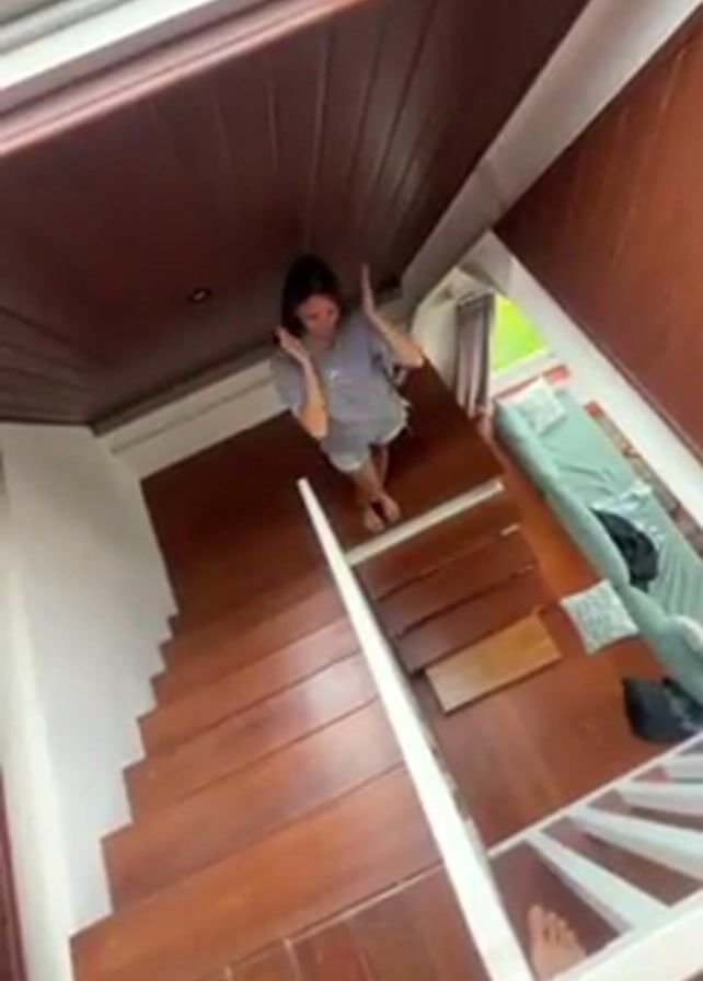 A high-angle shot shows a woman standing in the middle of a wooden staircase, barefoot and wearing a grey t-shirt and shorts