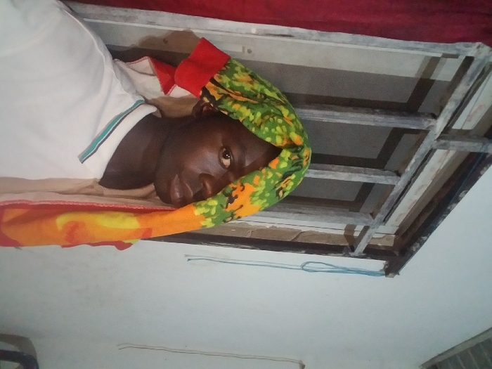 A person rests beneath a framed structure, likely a bed frame or ceiling. They wear a white shirt with striped sleeves and a brightly colored headwrap. The background features a red surface, possibly a bed covering or wall, and a white wall or ceiling below. A thin blue cord hangs loosely near the frame. The scene conveys a sense of casual relaxation.