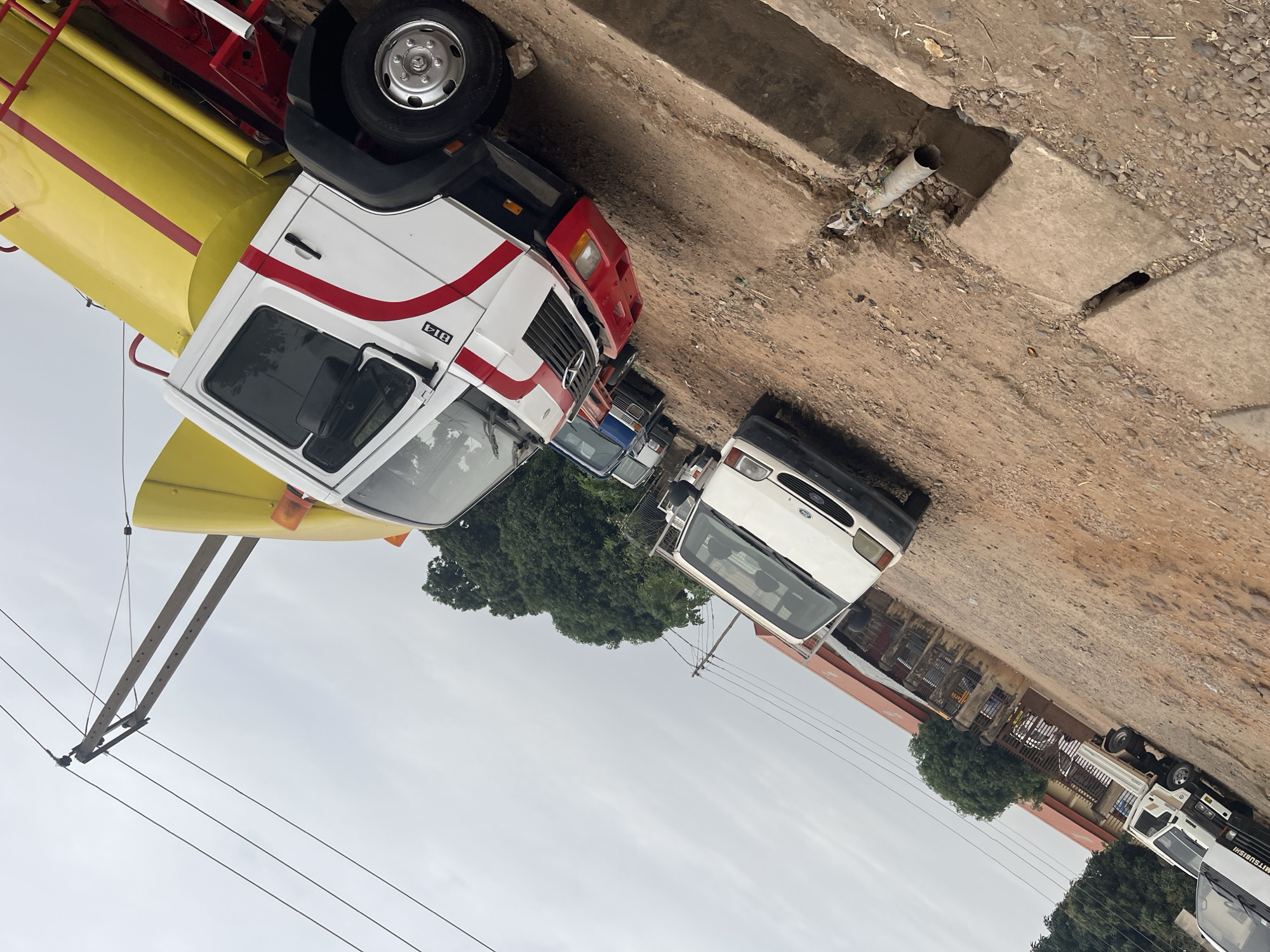 The image depicts a street scene in Barnawa, Nigeria. A yellow and white water tanker truck is parked along the side of the road. Several other vehicles are visible further down the street, including a white van. A concrete drainage ditch runs alongside the road. Overhead power lines are also present. The road surface is unpaved. Trees are visible in the background, as well as buildings.