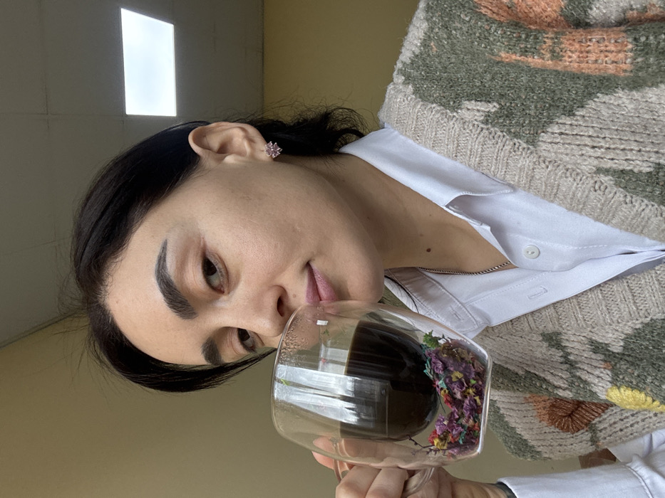 - "A woman with dark hair and fair skin poses with a glass of dark liquid and colorful flowers inside" by FM-FvWaA3, licensed under CC BY 4.0