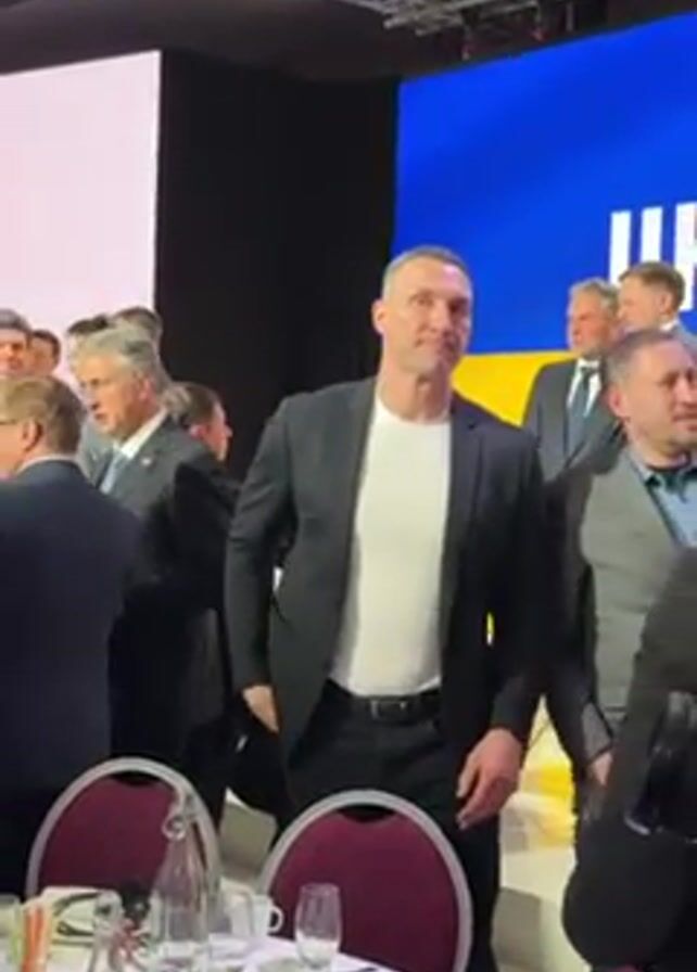 Vitali Klitschko standing amongst a crowd of people, mostly men, at an indoor event. He is wearing a black blazer over a white t-shirt, black pants, and a belt. He looks to the side and then back forward, seemingly aware of the camera. Behind him, a large screen displays blue and yellow colors reminiscent of the Ukrainian flag, partially obscured by the crowd. Several people are in suits and ties. In the foreground, there is a table set with glassware, a water bottle, and some food items, indicating a dining or reception setting. The lighting is bright, and the environment seems formal.