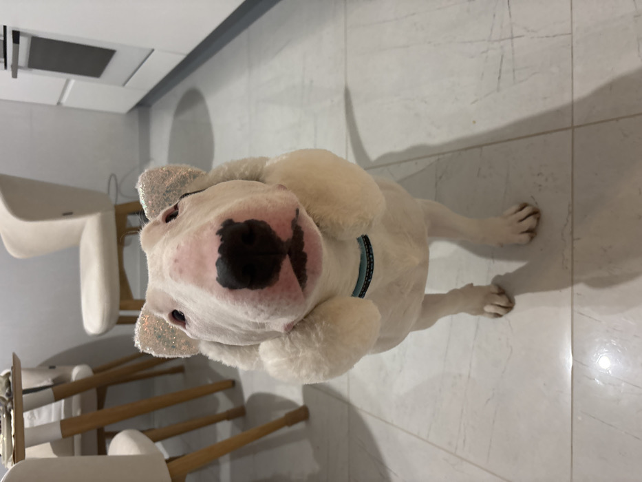 A white bull terrier lies on a tiled floor, tilted towards the camera. The dog has a black and pink spotted nose. The dog is wearing sparkly ear muffs. A blue and black collar is around its neck. White dining chairs with wooden legs are in the background, alongside a white kitchen counter. The photo's perspective gives the dog a prominent, endearing appearance.