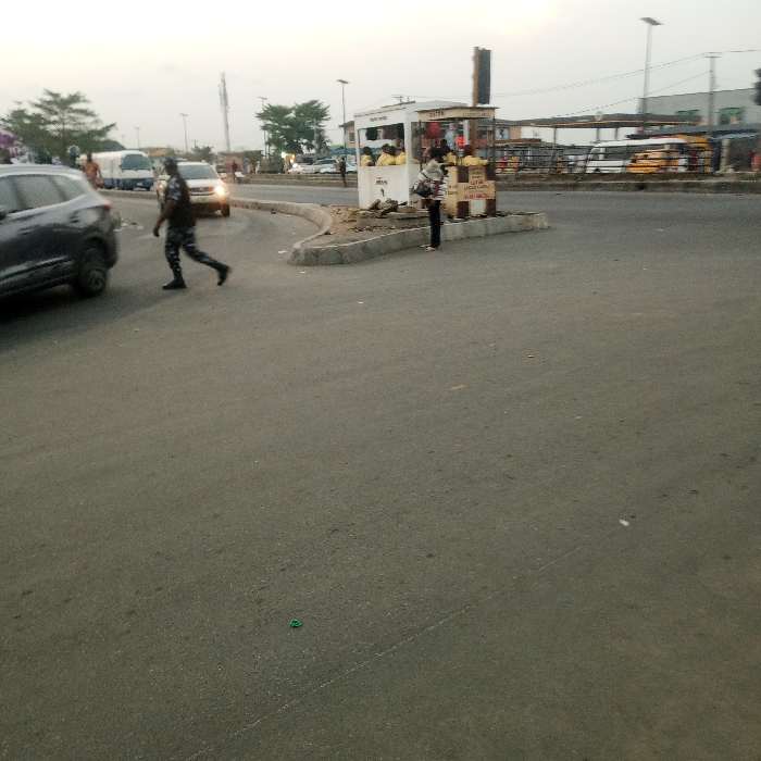 An urban scene features a wide asphalt road with a concrete curb. A police officer walks across the road, while a dark-colored car is partially visible on the left. A small white booth with people inside and around it sits on a traffic island. In the background, more vehicles and buildings are visible under a cloudy sky. The overall composition suggests a busy street scene during daylight.