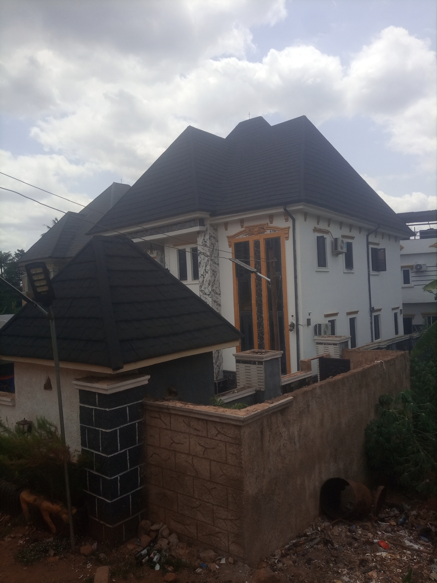 This image depicts a residential property in Alor, Nigeria, under a partially cloudy sky. The main subject is a large, two-story house with white exterior walls and multiple dark grey or black gable roofs covered with shingles, suggesting a recent construction or renovation. The house features decorative elements, including golden-brown trim around a tall, prominent multi-pane window on the front facade and similar trim above other windows. Several dark-colored, rectangular windows are visible, some equipped with external air conditioning units mounted below them on the white walls. One section of the house's exterior wall is adorned with grey stone cladding. In the foreground, a dark-colored, pyramidal roof structure, likely part of a gatehouse or similar small building, is visible. Adjacent to this structure is a tall, dark grey street light pole with a rectangular LED fixture at its top. A partial view of a low perimeter wall is present, constructed with tan-colored bricks featuring a textured pattern, topped by a lighter colored coping. A dark grey brick pillar with white mortar lines supports part of this wall. The ground area in the immediate foreground and to the right of the wall appears unpaved and somewhat unkempt, strewn with scattered debris including plastic bottles, wrappers, and what appears to be a rusty, dark cylindrical object lying on its side. Sparse, dark green vegetation is visible around the base of the wall and near the street light. Overhead, several utility wires traverse the frame against the cloudy sky. No individuals are visible in the scene.