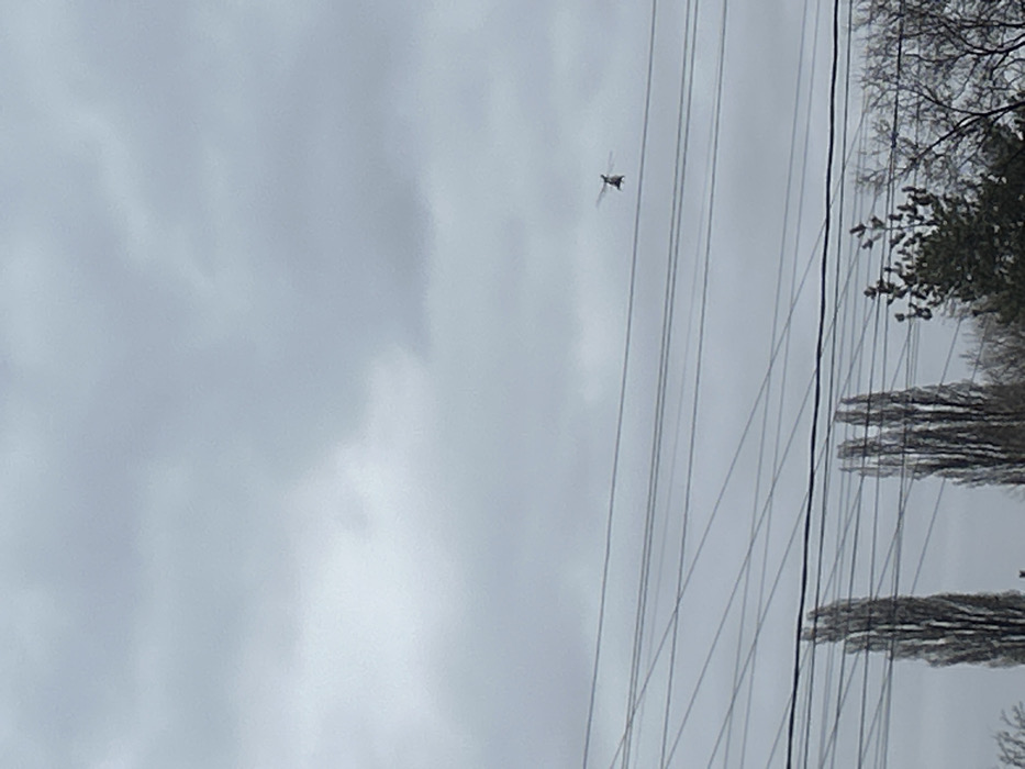 The image displays an outdoor scene in what is identified as German, Bulgaria, under an overcast sky. A small, dark-colored helicopter with visible main and tail rotors is captured in flight, positioned in the upper-middle portion of the frame. Multiple horizontal power or communication lines, approximately eight in number, stretch across the mid-ground, running parallel to each other. Below these lines, the upper sections of several tall, slender deciduous trees with bare branches are visible on the left side, while evergreen foliage is present on the right. No human figures are discernible within the frame.