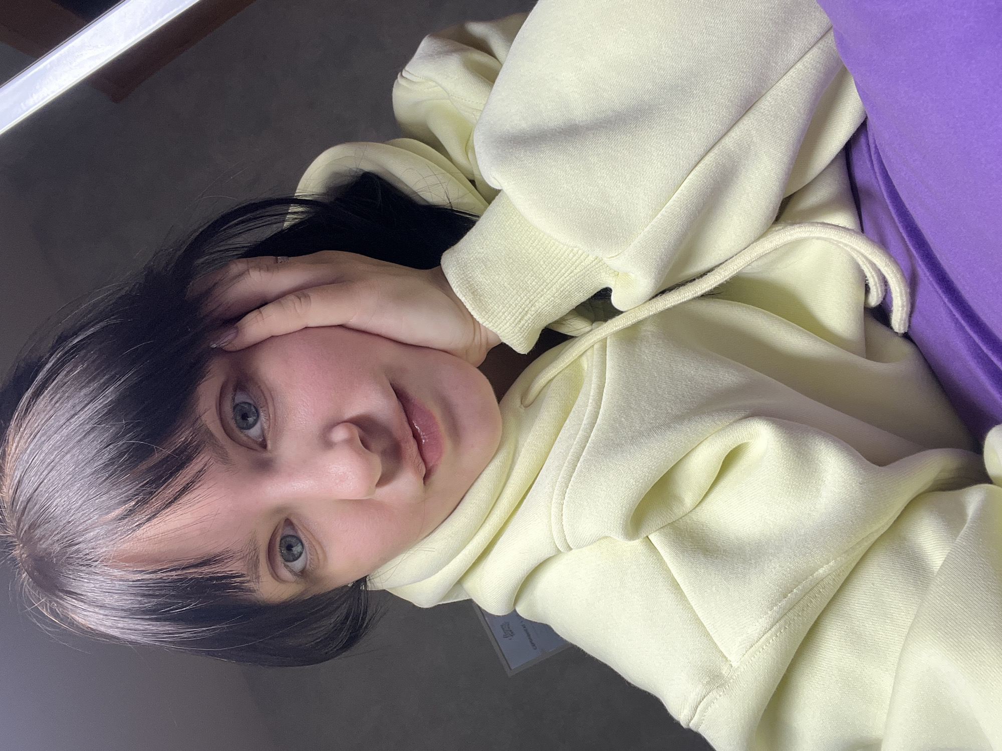 A young woman with black hair and blue eyes is looking at the camera. She is wearing a light yellow hooded sweatshirt and has her hand on her face. A purple object is in the background. The photo appears to be taken indoors under artificial lighting. There is no information that would support the location being Марковский, Russia.