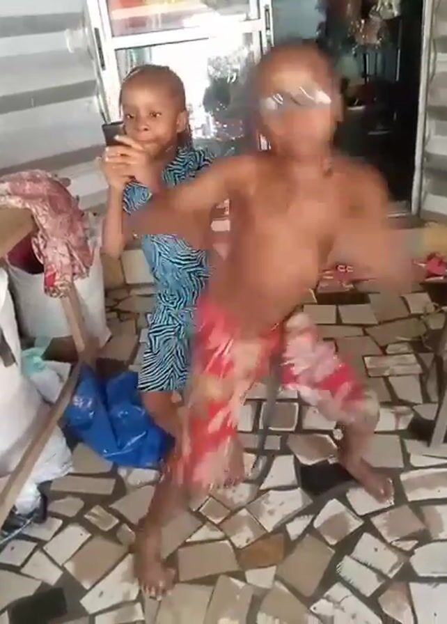 Two young children are on a tiled porch in front of a glass-paned door. The girl, wearing a blue zebra-print dress, holds a mobile phone and looks at the screen. The boy, wearing glasses and red floral print pants, is shirtless and energetically dancing. Both children are barefoot. Behind them are objects and furniture covered with fabric, bags, and a chair. The porch has a patterned tile floor in neutral colors. The door behind the children reflects the interior of the house.