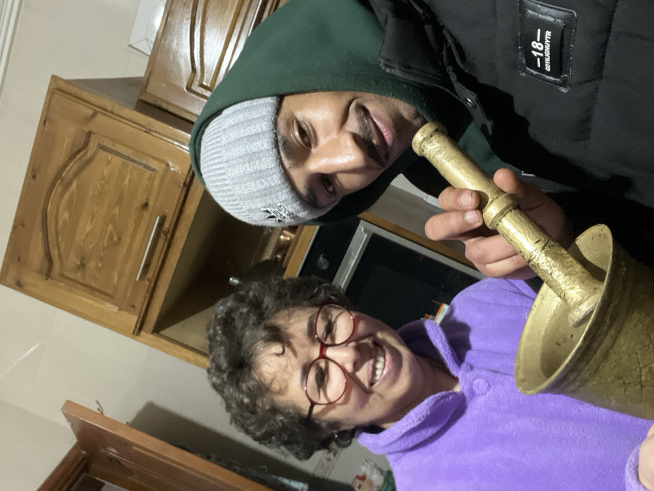 Two people pose for a selfie in a kitchen. A younger person with a gray beanie and green hood holds a large brass mortar and pestle. An older woman with glasses and curly hair smiles, wearing a purple jacket. Wooden cabinets are visible in the background, along with a built-in oven. The photo appears tilted slightly, creating a casual, candid feel.