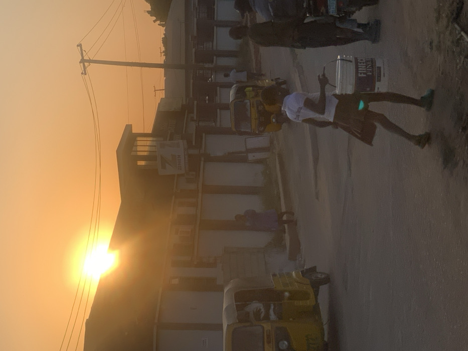 An outdoor scene under an orange sky features a building with a "ZENITH" sign, utility poles with lines, and several yellow auto rickshaws (tuk-tuks). A person in a white shirt carries a container marked "FINEST." Other people are present on the street. The lighting is intense, suggesting either sunrise or sunset.