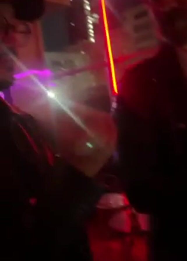 group of people in what appears to be an outdoor bar or patio at night. The lighting is predominantly red and purple. One person is holding a red lollipop and a small plate with what appears to be a white food item, possibly cheese or dip. The people are standing and talking, but the content of their conversation is inaudible. Several of the individuals are wearing jackets and caps. The background includes cityscape visible through the outdoor structure.