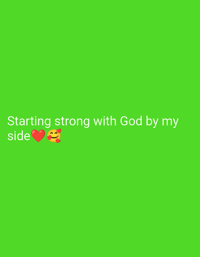 The image presents white sans-serif text and two emojis superimposed on a solid, uniform bright green background. The text, "Starting strong with God by my side," is positioned in the lower-left quadrant of the frame. Immediately following the text are a red heart emoji (❤️) and a yellow smiling face emoji with three small red hearts around it (🥰). There are no discernible people, physical objects, actions, interactions, or environmental features visible in the image. The image provides no visual information to determine a specific location within Festac Town, Nigeria, or any other geographical area.