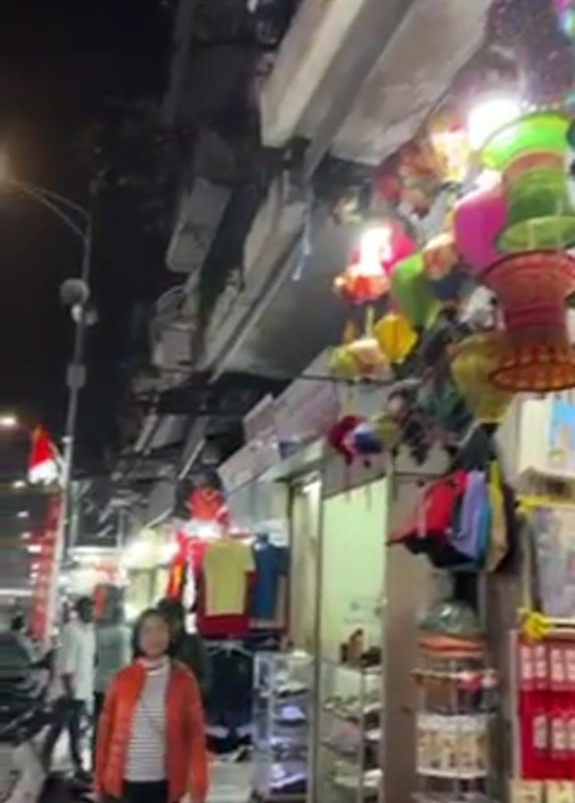bustling street scene at night, likely in Vietnam, with a crowded street filled with scooters and pedestrians. Shops line the street, with some displaying colorful lanterns. A woman in an orange jacket is seen walking along the sidewalk. The scene is brightly lit by streetlights and shop lights.