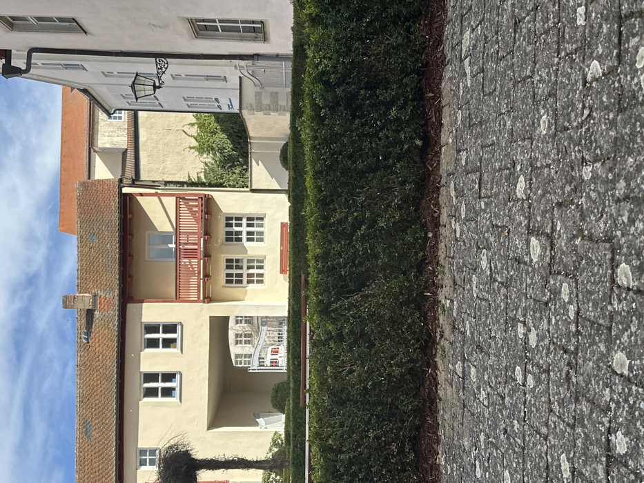 The image displays an exterior daytime scene in Weißenburg in Bayern, Germany, featuring historical European architecture and landscaping under a partly cloudy sky. The foreground consists of a grey paver pathway exhibiting lichen growth. Immediately behind this, a neatly trimmed dark green hedge with brown mulch at its base extends horizontally across the frame. A reddish-brown wooden park bench is partially visible behind the hedge. In the background, a row of interconnected two-story buildings dominates the scene. The central structure features a light yellow stucco facade, a reddish-brown tile roof, and a prominent red-painted wooden balcony on the first floor with a white-framed window/door opening onto it. Below the balcony, two white-framed windows are present on the ground floor. To the left of this central section, the building includes an arched ground-floor passageway leading into a courtyard, where a white metal gate is visible. Two white-framed windows are on the first floor to the left of the archway. A bare, dark-branched tree stump is partially visible on the far left. A chimney stack protrudes from the roofline of the central building. To the right, a taller, multi-story building with a light cream-colored facade stands adjacent, featuring an ornate black metal lantern affixed to its wall and multiple rectangular windows. A stone wall with a white metal gate continues from the courtyard entrance area. Green foliage grows against a lighter wall visible between the central and right-most buildings. Strong sunlight illuminates the scene, casting distinct shadows from the buildings and architectural features. No people or discernible actions are present.