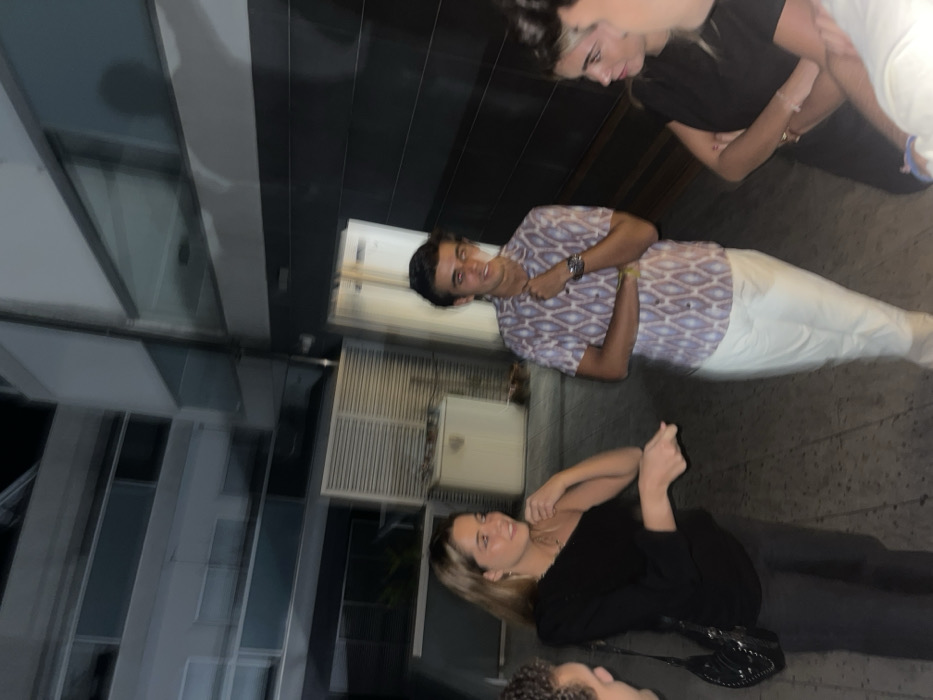 The image depicts five individuals, identified as young adults, standing outdoors at night in Vila Nova de Gaia, Portugal. The setting appears to be a paved area adjacent to a modern building. From left to right: A person with dark, curly hair is partially visible on the far left, facing right. A female with long, light brown hair, wearing a black one-shoulder top, dark pants, a necklace, earrings, and a black studded shoulder bag, stands center-left. She is smiling, with her left hand near her shoulder and her right hand extended forward. A male with dark hair stands centrally, wearing a short-sleeved collared shirt with a geometric pattern (light blue, purple, and white tones) and white pants. He has a wristwatch on his left wrist and a yellow bracelet on his right, looking towards the right side of the frame with a slight smile. A female with blonde hair, pulled back, is partially visible on the center-right, wearing a dark top and an item resembling a watch or bracelet on her left wrist. Her arms are crossed, and she looks towards the left. A person with light-colored, short hair is partially visible on the far right. The background features a modern building with multiple levels, incorporating white or grey panels and sections of glass reflecting ambient light. A prominent white louvered panel is visible behind the left side of the group. The ground is a dark, textured surface. The scene is dimly lit, illuminated primarily by artificial light sources and what appears to be a camera flash, resulting in some motion blur.