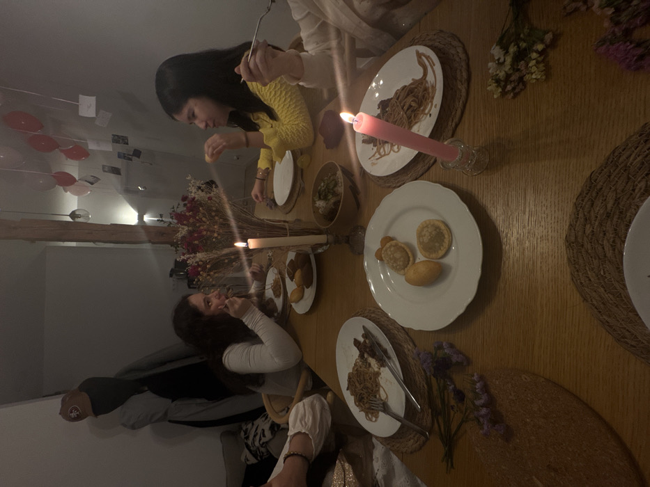 A cozy dining scene unfolds with two women enjoying a meal. One wears a yellow sweater, the other a white long-sleeved shirt. The table is adorned with plates of food, a bowl of salad, candles in glass holders, and flowers. Round woven placemats sit beneath each plate. Balloons and photos are strung above, adding a celebratory touch to the intimate gathering.
