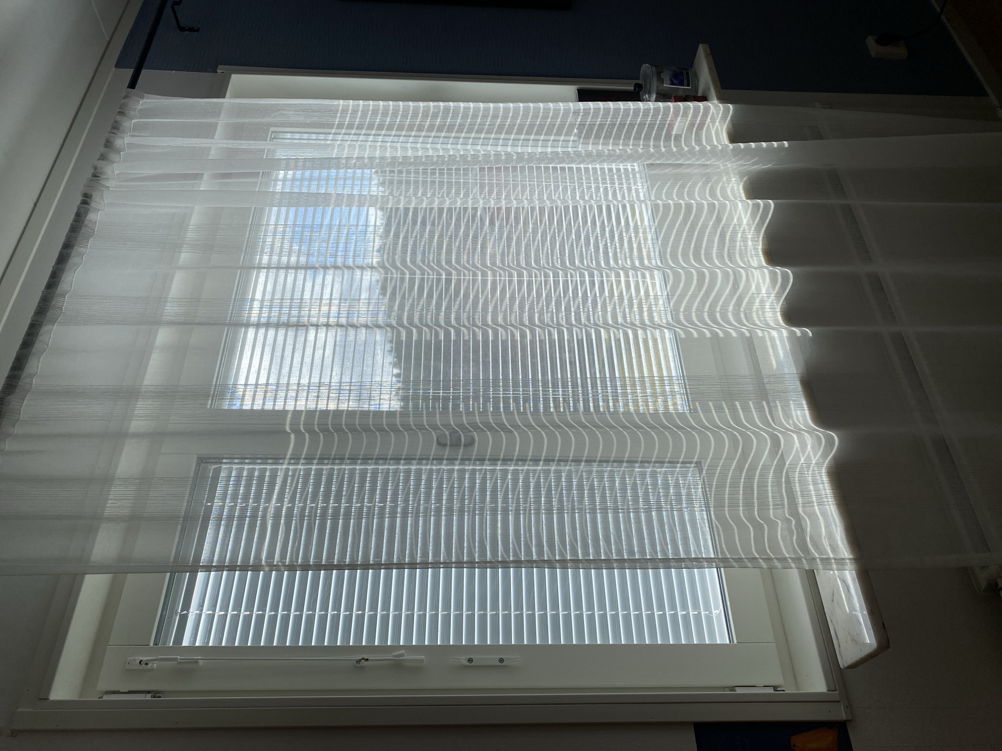 - "window with two sections of blinds, covered by a sheer, pleated white curtain" by FM-zSmrO2, licensed under CC BY 4.0