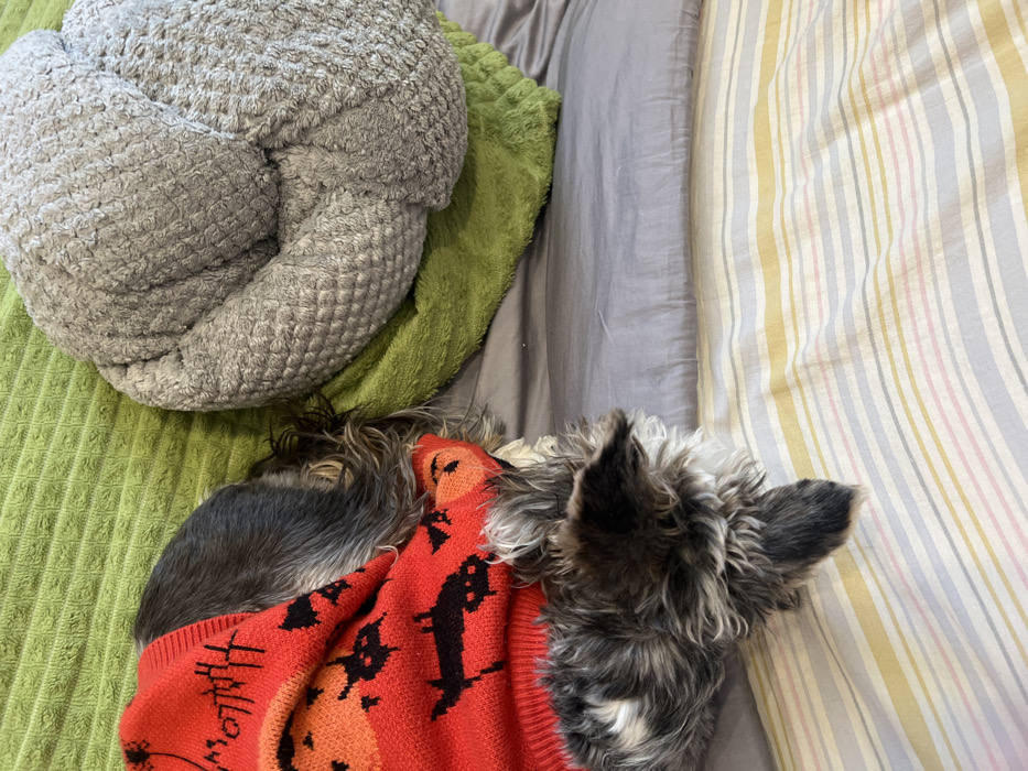 The scene is located in the city of Leninakan, Russia. A small, shaggy-haired dog is resting on a layered surface of textiles. The dog wears a red knitted sweater patterned with black and orange Halloween motifs, including the word "HALLOWEEN," bats, and circular designs. Its head is oriented towards the bottom-right of the frame, facing away from the observer. The dog's torso, partially obscured by the sweater, rests on a grey sheet. Adjacent to the dog's back is a green, textured blanket, which lies beneath a bunched-up grey, textured pillow or blanket on the right side of the frame. The lower portion of the image reveals a striped sheet with alternating thin bands of white, yellow, grey, and pink.