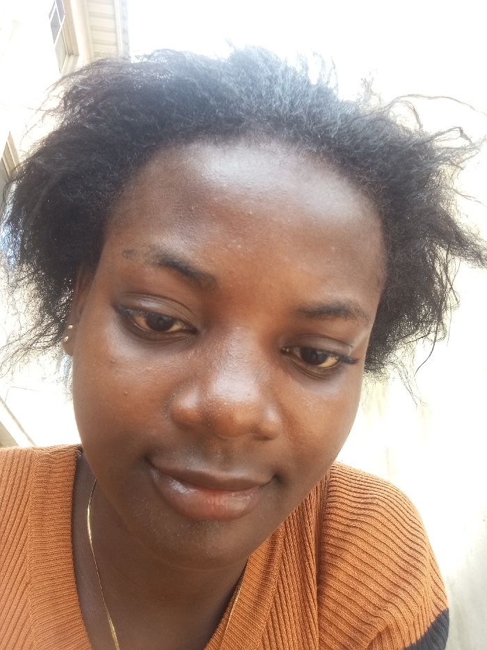 A close-up portrait shows an adult female subject with dark skin and dark, natural, kinky hair