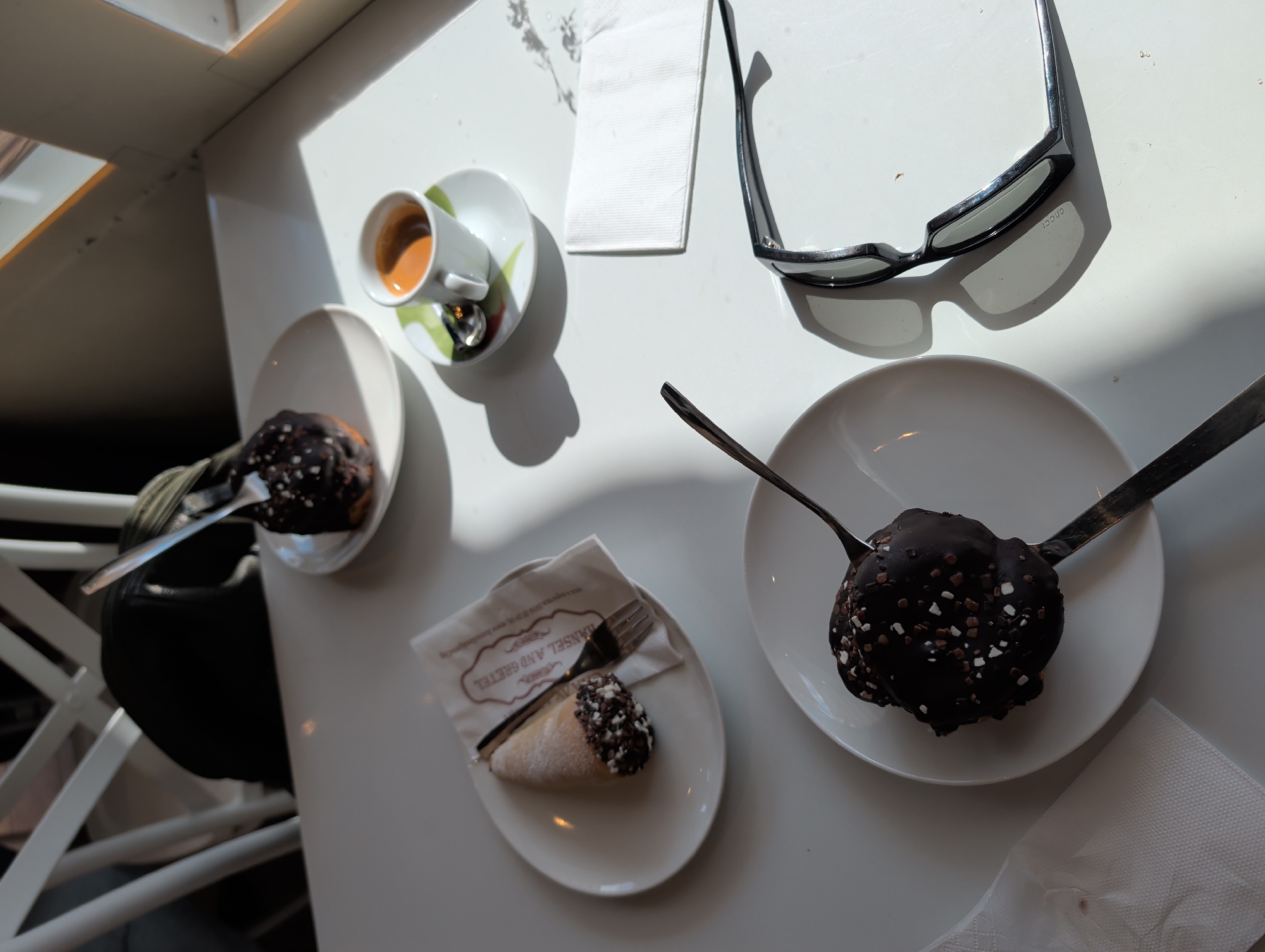 An overhead shot shows a white table with a white napkin, a pair of sunglasses, three plates with pastries, and a cup of coffee. One plate holds a round chocolate pastry with white sprinkles, pierced by a fork. Another plate shows a cannoli-like pastry, also adorned with chocolate and white sprinkles, accompanied by a fork resting on a napkin that reads "HANSEL AND GRETEL". The third plate also presents a chocolate pastry and a fork. The coffee cup is white and filled with a light brown liquid. A chair is slightly visible on the lower left of the image. The pastries suggest the location is Hansel and Gretel cafe in Pleven, Bulgaria.