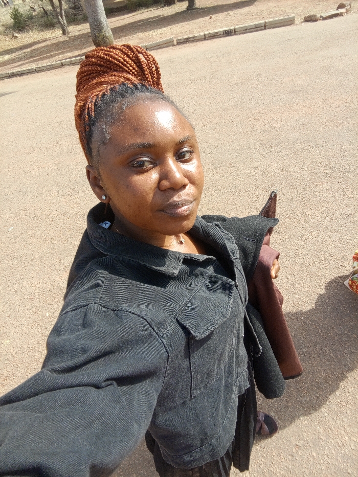 The image displays a forensic view of a scene in Barakin Lerawi, Nigeria, featuring a single dark-skinned female individual outdoors on a sunny day. The individual has reddish-brown braided hair styled in a high bun. She is wearing a dark, possibly black or charcoal gray, collared jacket with two visible chest pockets and a small, light-colored stud earring in her right ear. A delicate necklace with a small pendant is visible around her neck. Her skin exhibits a slight sheen, possibly due to lighting or perspiration. Her left arm is extended, presumably holding the camera to capture a selfie, and she is looking directly into the lens with a neutral expression. Her right hand is visible, holding a piece of dark brown or maroon fabric. Dark footwear, possibly sandals, is partially visible on her feet at the bottom right of the frame. The immediate background consists of a light brown, possibly asphalt or dirt, paved surface. Further back, a light-colored concrete curb separates the paved area from an unpaved section containing sparse dry vegetation, rocks, and the trunks of at least two trees under direct sunlight, casting distinct shadows.